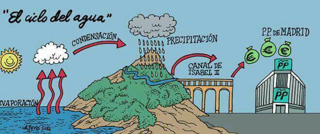 Noticias y sucesos como los relacionados con el sumidero económico del Canal de Isabel II no me alegran, pero confirman algunas de las luchas en las que me vi involucrado cuando trabajé en el mundo de la gestión y de la planificación del agua. Aquí puedes ver algunos artículos sobre ello. Una constante durante aquellos procesos contra los planes hidrológicos, las políticas megalómanas y la privatización de la gestión del agua urbana fue la denuncia constante de la corrupción que imperaba en el sector de la gestión y la construcción de las grandes infraestructuras. Los interlocutores políticos con los que se suponía debíamos debatir las propuestas eran unos corruptos que expoliaban el patrimonio económico y natural de los recursos hídricos que debían gestionar. Siempre lo supimos y ahora la prensa y los jueces lo empiezan a airear. Lo peor de todo ello: la prepotencia con la que aparecían en público, su farisea fachada de bonhomía y de caballeros de bien, frente a los indocumentados y descamisados que denunciábamos y que proponíamos otro tipo de políticas, sobre todo, que la principal variable de decisión a la hora de gestionar el agua haya sido la corruptela y los apaños de familia, que los que debían gestionar el agua se hayan dedicado, sobre todo, a robar dinero público y de paso, esquilmar los recursos hídricos peninsulares.