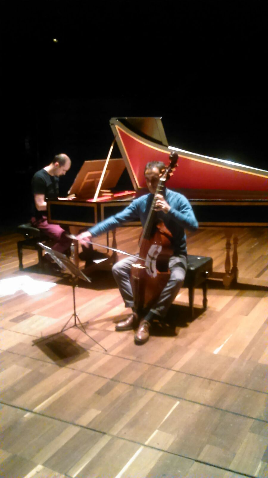 En escena, Vittorio Ghielmi con su viola da gamba de 7 cuerdas, y Daniel Oyarzabal improvisando y acompañando al clave. Pudimos apreciar el diferente estilo que adoptó la viola da gamba en los compositores renacentistas españoles, en contraste con el estilo elegante, serio, idiomático y señorial que se creó en Francia. El estilo francés consideró que la viola era como una voix humaine, y por tanto, que debía traducir en música los afectos y emociones que se expresaban oralmente en la lengua francesa. Para ello, M. Marais, uno de los compositores de ayer, le añadió la séptima cuerda grave, para emparentar aun más al instrumento con el timbre humano.
